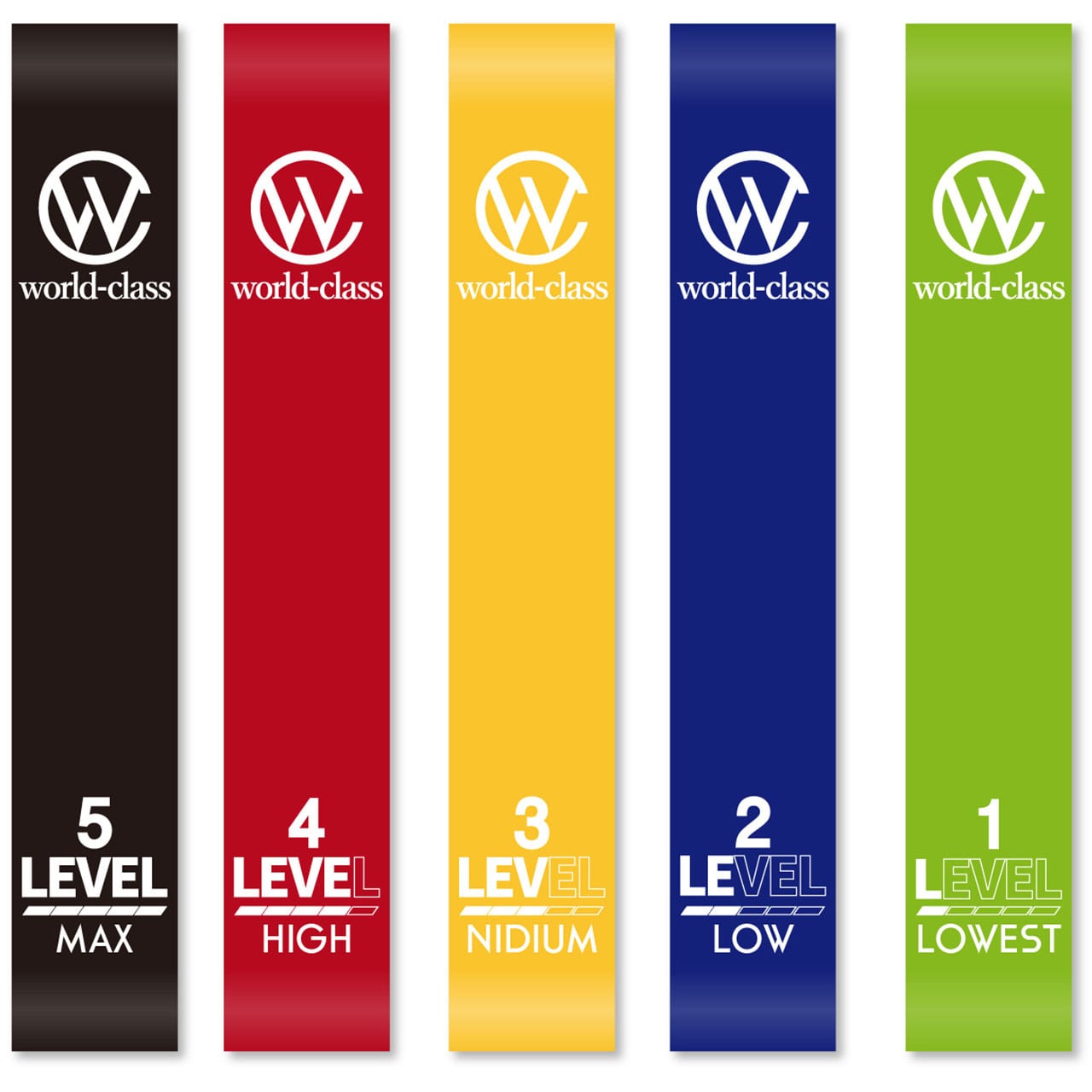 ■【高品質で分かりやすい5段階表示】 高級素材である100%天然ラテックスを使用しています。耐久性に優れた素材で伸縮性と柔軟性が高く、強く引き伸ばしてもちぎれることがありません。製造は複数の工場にサンプルを取り寄せ一番品質の良い製品の工場と提携しました。 洗練されたデザインで強度がひと目でわかります。:弱い:GREEN(緑) やや弱い:BLUE(青) 普通:YELLOW(黄) 強い:RED(赤) とても強い:BLACK(黒)。となっています。高負荷、高強度から強度弱めまで、高品質なレジスタンスバンドです。