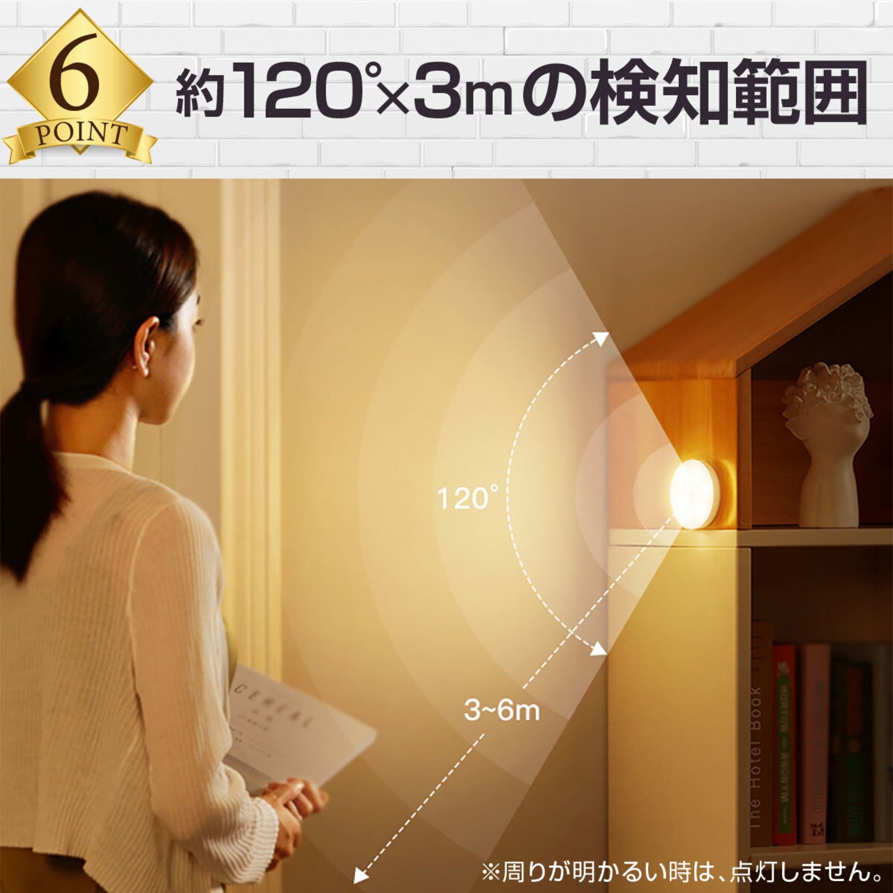 120°×6mの範囲の人を検知して自動で点灯するコードレスのセンサー照明。