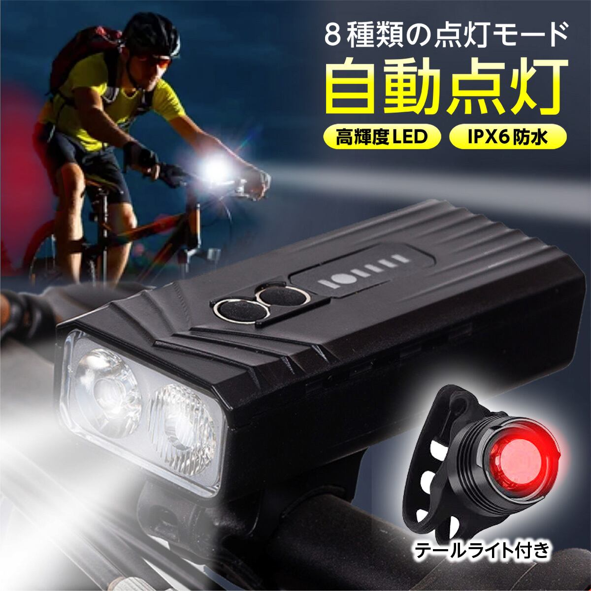 【ベルキューナ】自転車ライト LED 明るい 自動点灯 ヘッドライト 5200mAh テールライト付き 大容量 8種点灯モード USB充電 高輝度 感知センサー 防水 1500ルーメン